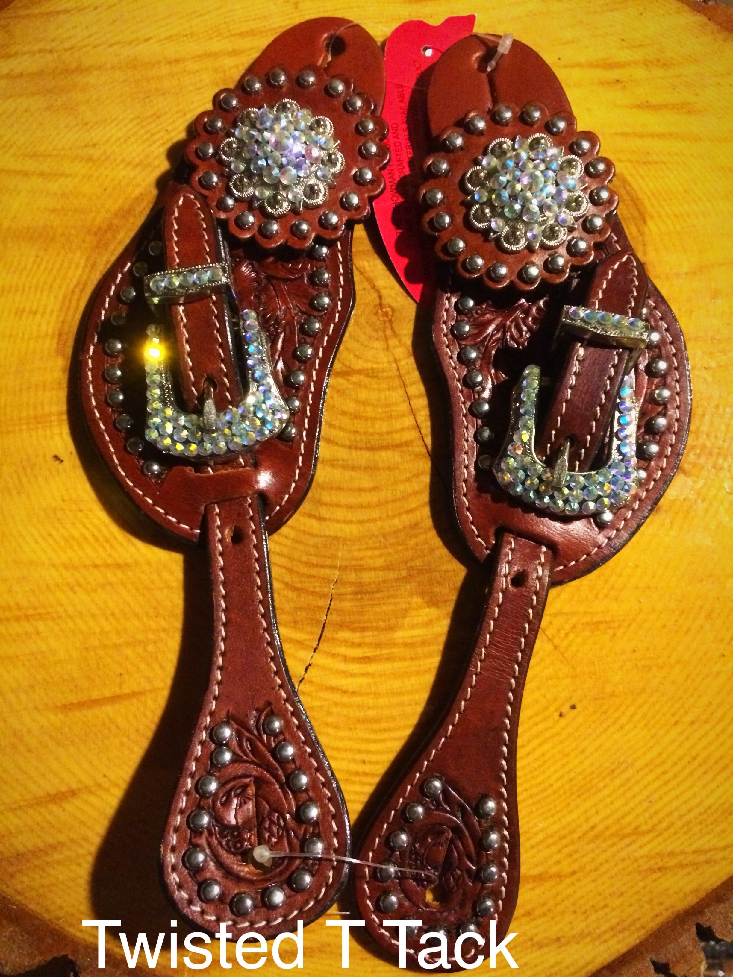 Ladies Tooled Leather Spur Straps with Crystal Rhinestone Hardware and conchos. These spur straps feature oakleaf tooling accented with silver studs. Buckle and hardware are adorned with crystal rhinestones. Spur straps feature silver conchos accented with clear crystal rhinestones.