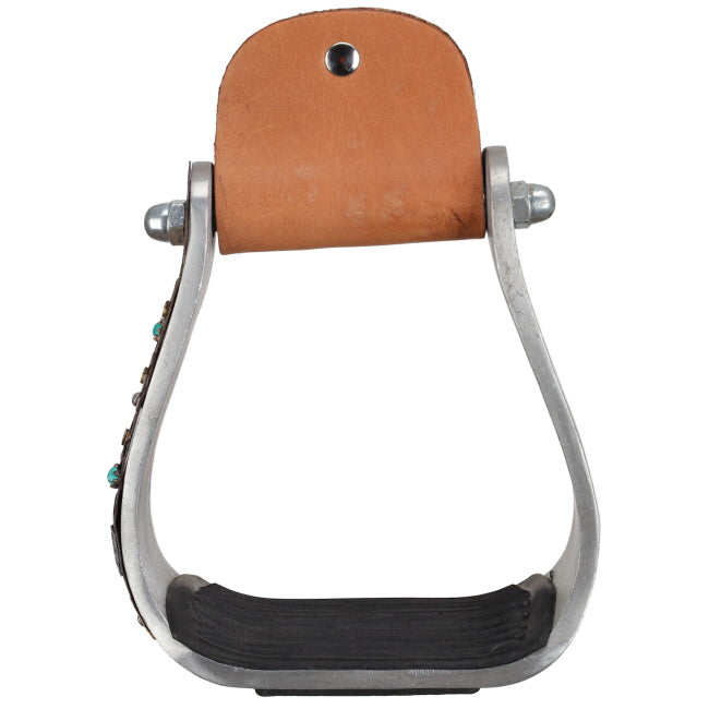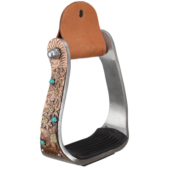 The Showman® Canyon Bloom Aluminum Stirrups add a bold touch of color and style to any saddle while offering the durability and security riders need. Made from lightweight aluminum, these stirrups feature a copper-colored overlay on the outer side, beautifully engraved with floral designs and accented with turquoise studs. The unique combination of copper tones and turquoise details creates a striking western look that stands out in the arena or on the trail.